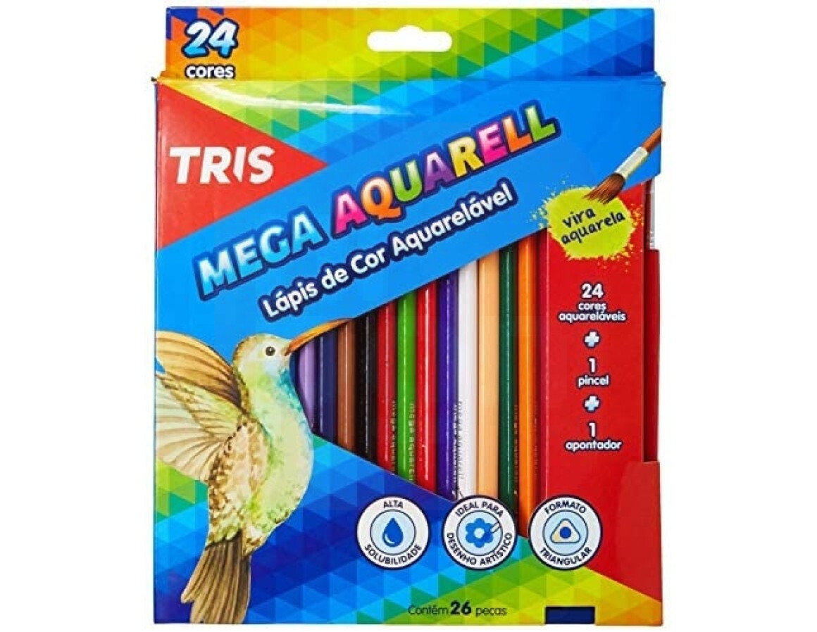 Características do Produto: Os Lápis de Cor Mega Aquarelável da Tris têm formato triangular, proporcionando mais conforto na escrita, ponta grossa de 2,9mm mais resistentes com a escrita super macia. Embalagem em papel cartão. Além, é claro, de vir com 24 cores aquareláveis com alta solubilidade, muito intensas e incríveis; 1 pincel e 1 um apontador. Produto atóxico com prazo de validade indeterminado.